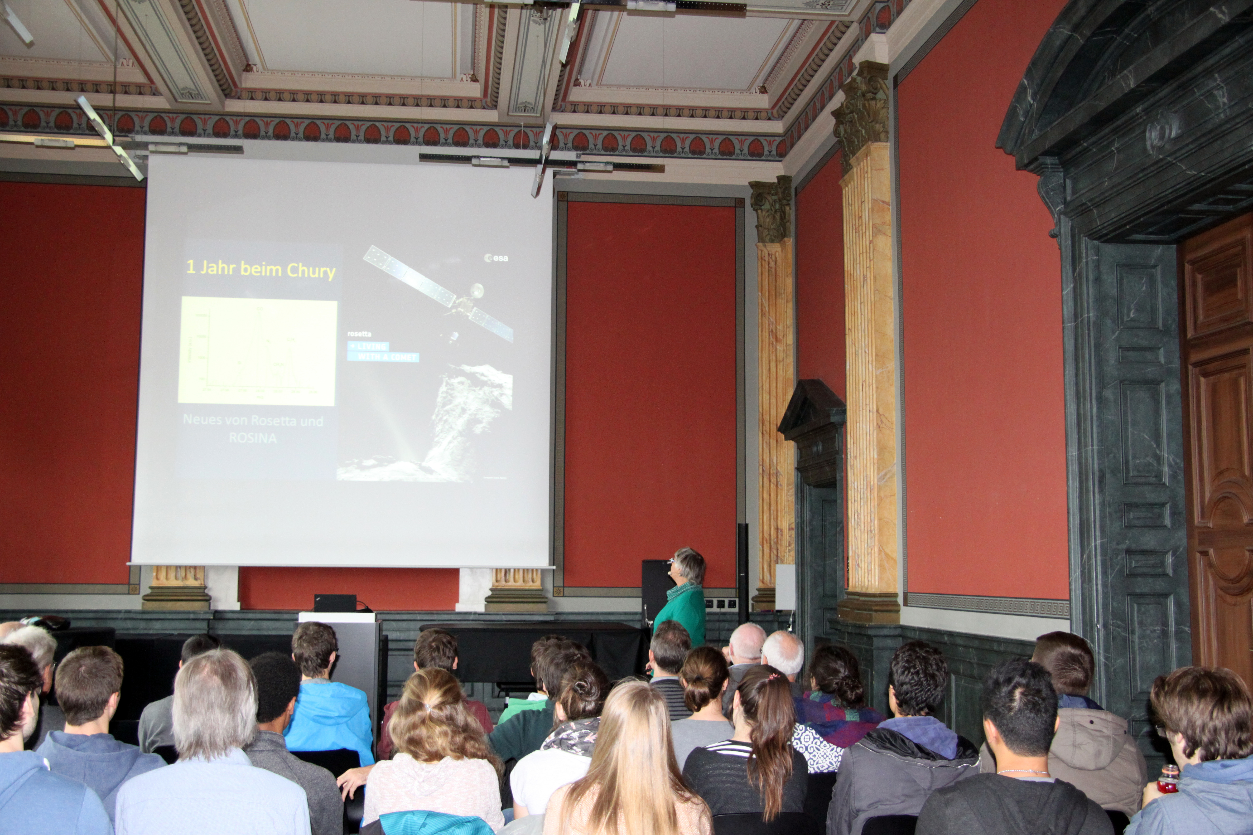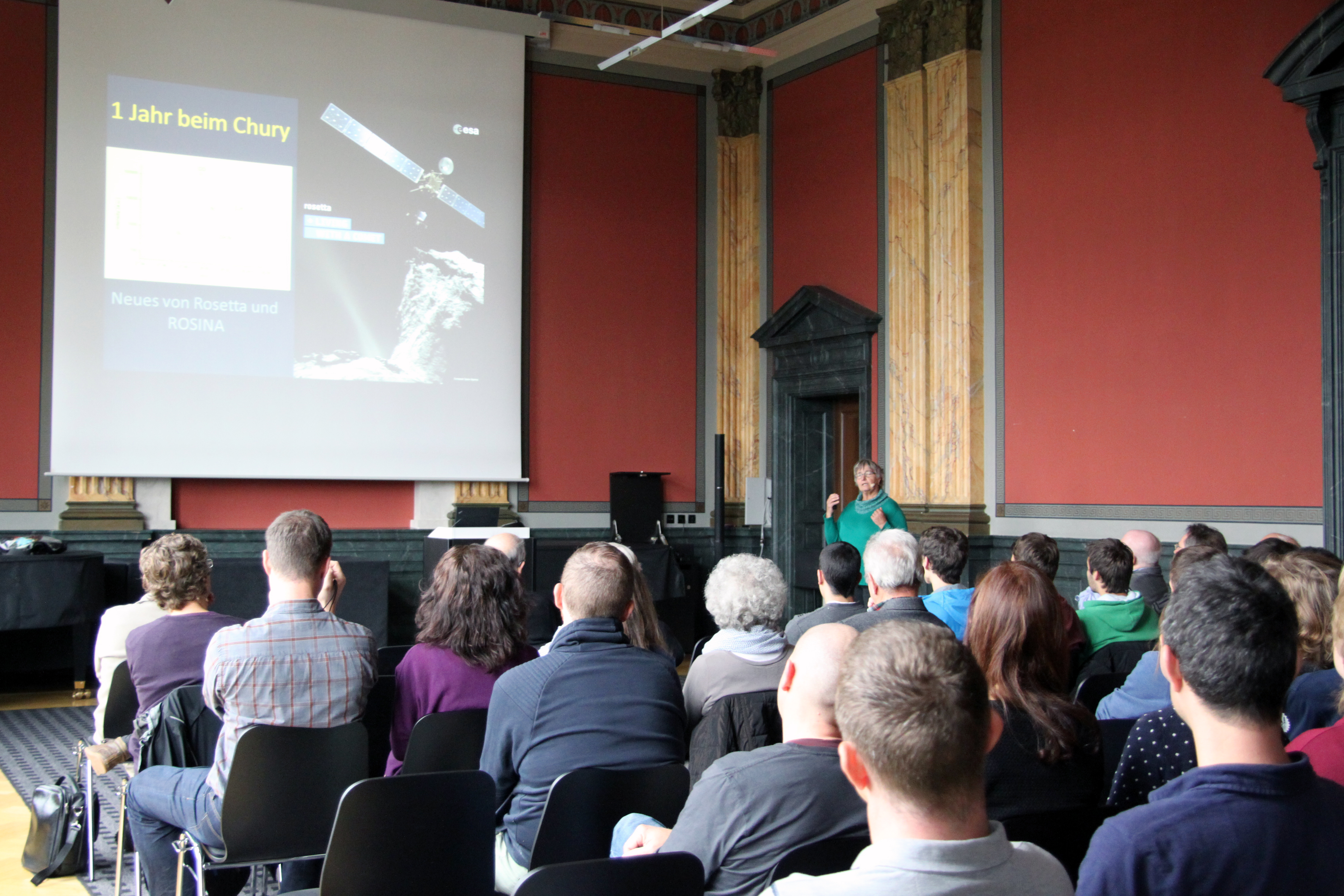 Mit der Landung des Weltraumlabors Philae auf dem Kometen Tschurjumow-Gerasimenko am 12. November 2014 erreichte die Rosetta-Mission der europäischen Raumfahrtbehörde ESA ihren vorläufigen Höhepunkt. Über den aktuellen Stand der Forschungsergebnisse hat uns Frau Prof. Dr. Altwegg, Universität Bern, in ihrem Vortrag berichtet.