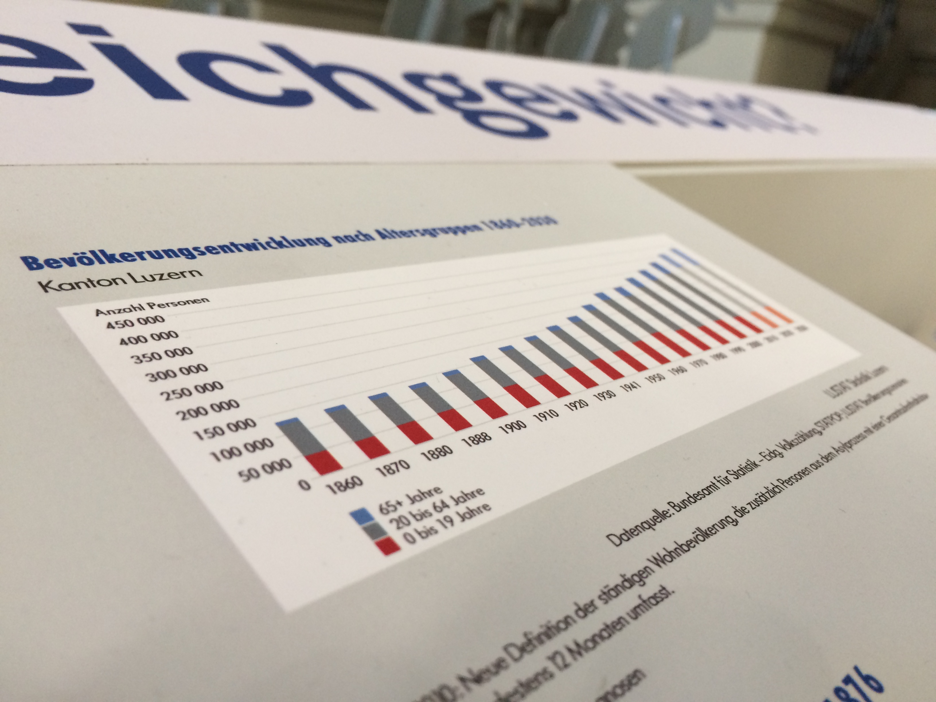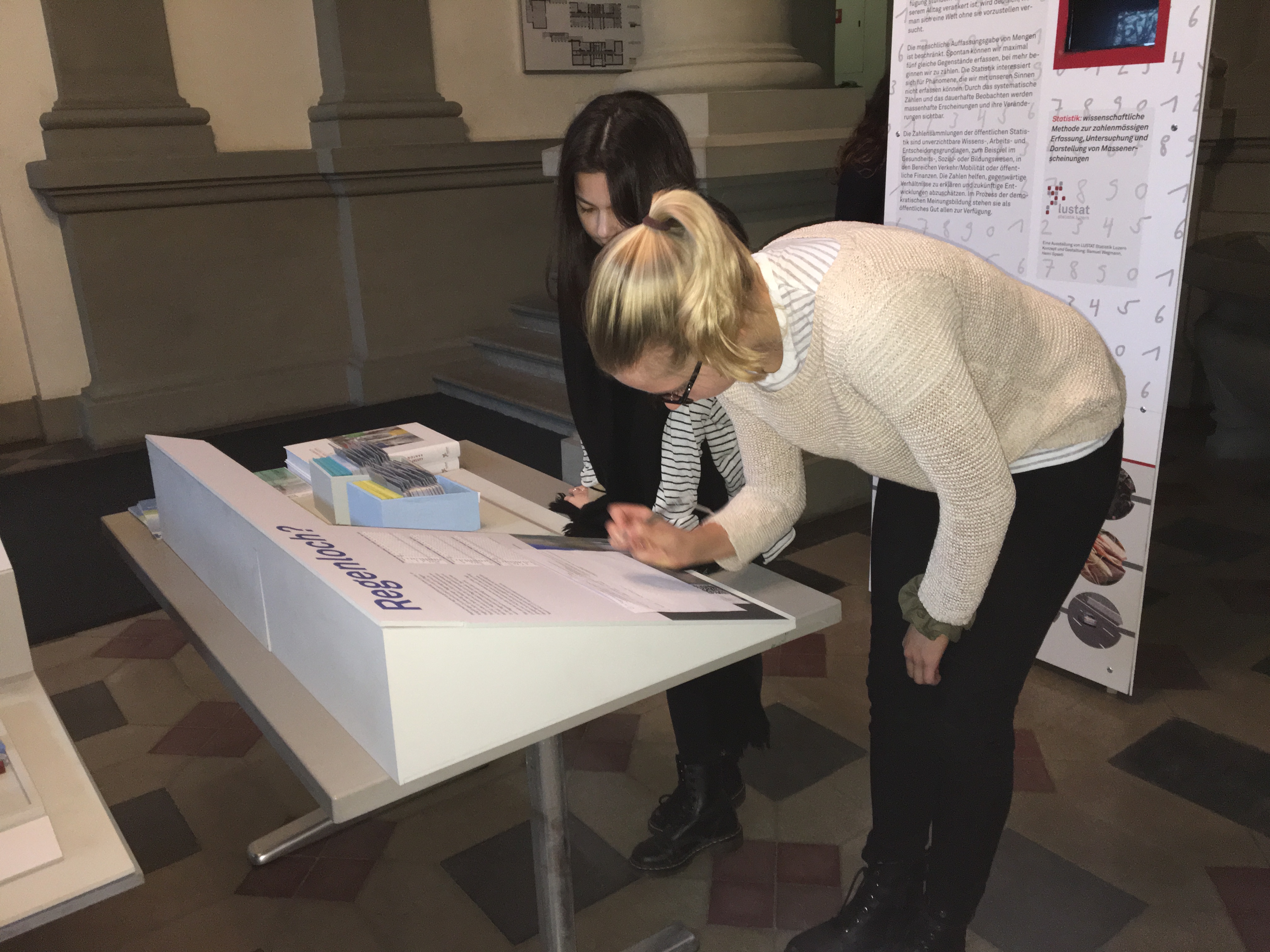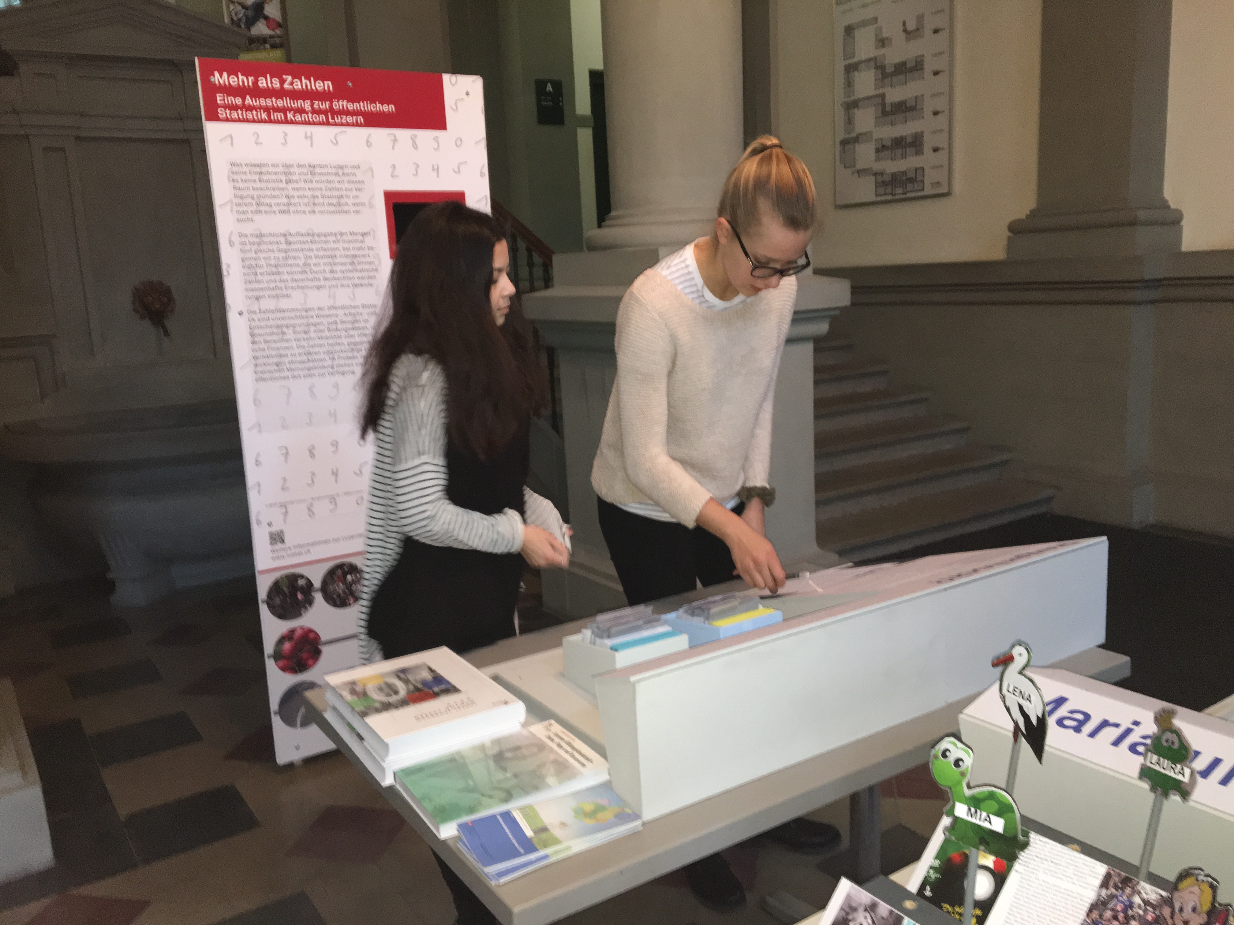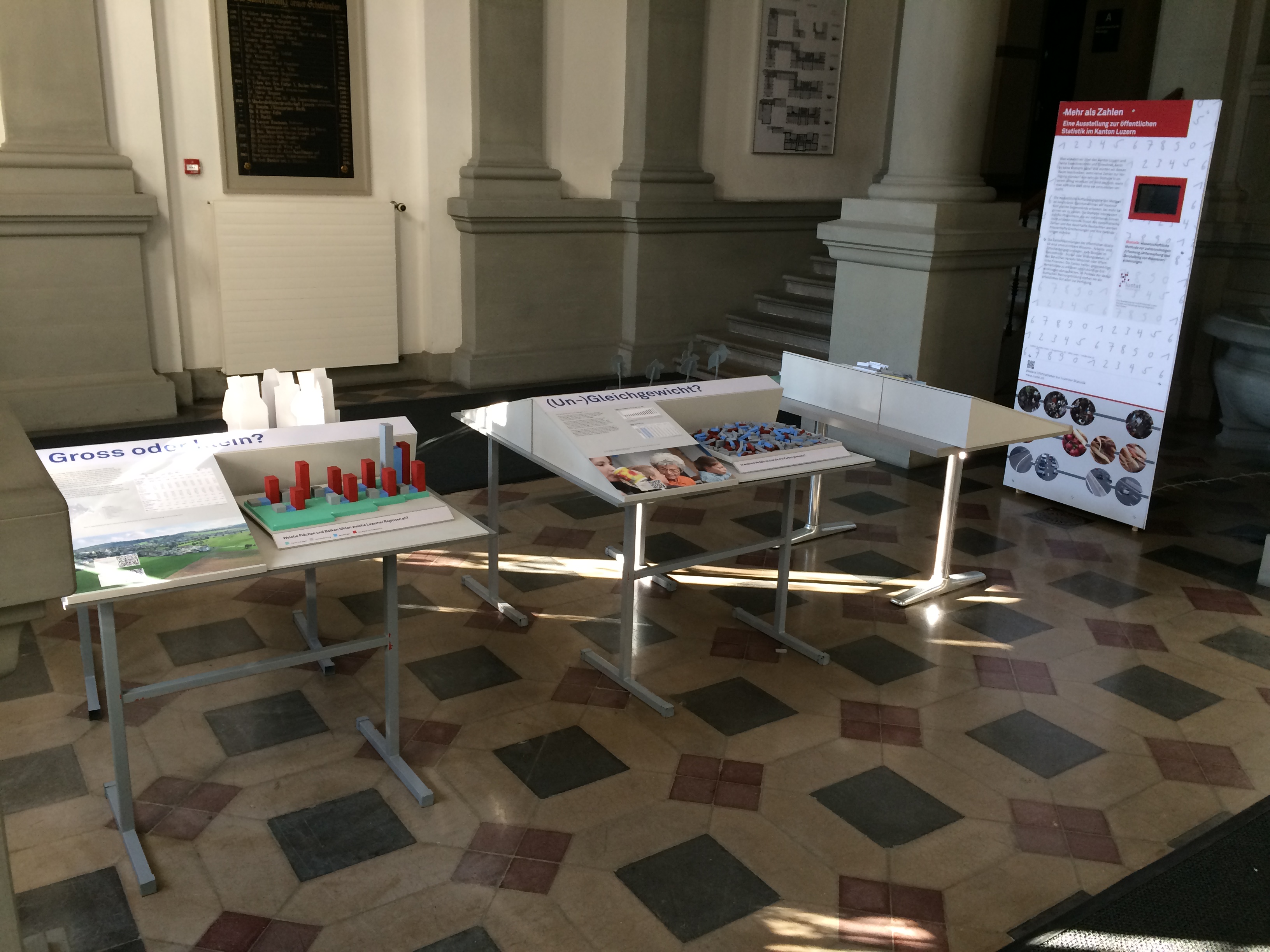 Vom 1. Dezember 2016 bis am 26. Januar 2017 ist die Wanderausstellung «Mehr als Zahlen» zu Gast an der Kantonsschule Musegg Luzern. Die Ausstellung von LUSTAT Statistik Luzern gibt einen Einblick in die Welt der öffentlichen Statistik und die Vielfalt ihrer Daten. Besuchen Sie die Ausstellung im Eingangsbereich und Treppenhaus des Museggschulhauses und finden Sie heraus, ob der Kanton Luzern ein «Regenloch» ist, ob ihr Vorname zu den häufigsten im Kanton gehört oder ob Sie mehr essen, arbeiten, reisen usw. als eine durchschnittliche Person im Kanton Luzern.